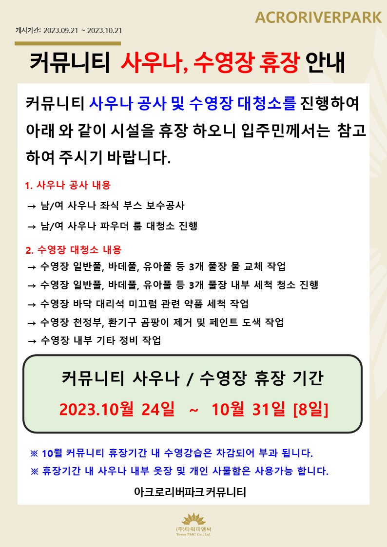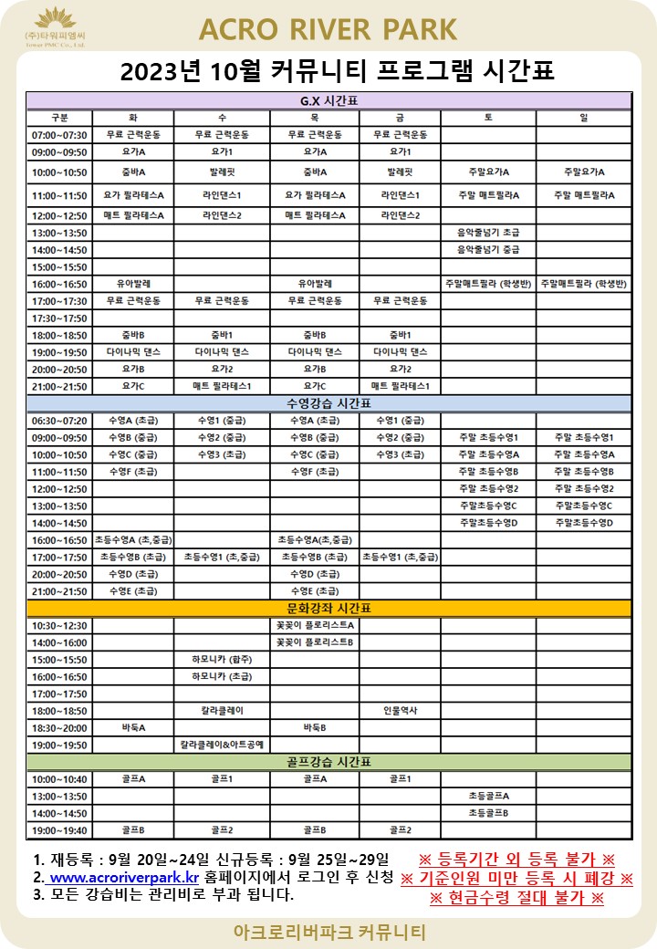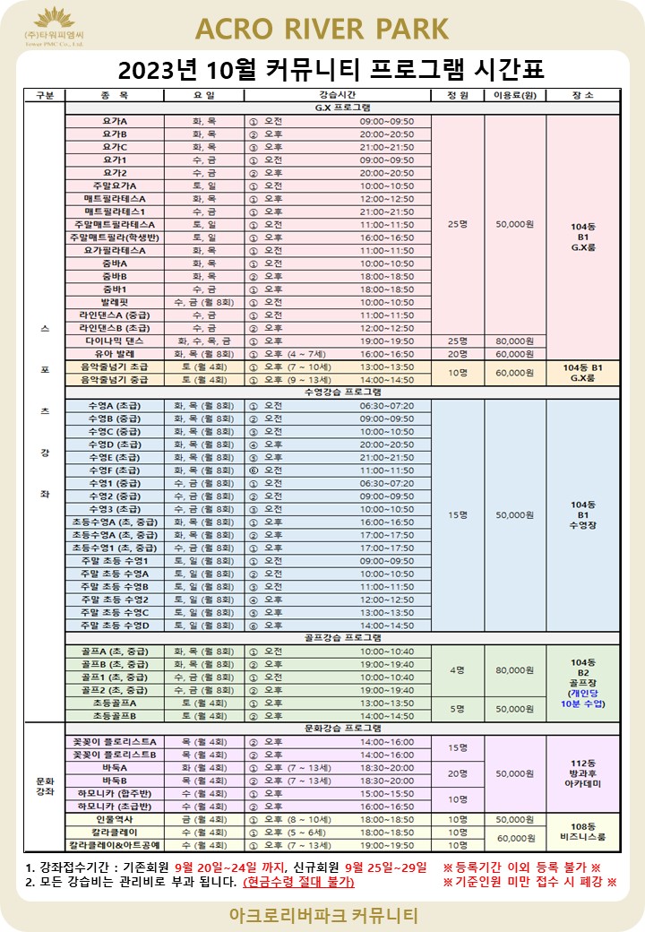 * 줌바 B가 9/20 오픈수업 이후 개강되었습니다. * 10월 24 ~ 31일은 사우나/수영장 휴관일입니다. 아래 안내문을 확인하시어 프로그램 신청에 참고해주시기 바랍니다. ========================================================================= |