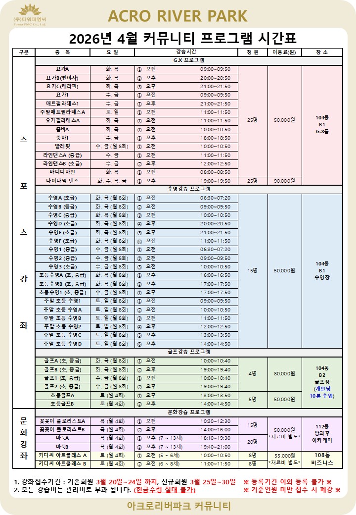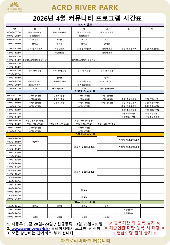 공지 2026년 4월 커뮤니티 프로그램 스케줄 작성자 acroriverpark 첨부 파일 슬라이드1.JPG [ Size : 244.86KB, Down : 140 ] 미리보기 다운로드 슬라이드2.JPG [ Size : 227.44KB, Down : 122 ] 미리보기 다운로드 내용 2026년 4월 커뮤니티 프로그램 스케줄을 안내 드립니다. 태그 작성일 2026년 3월 13일 17시 33분 3초 수정일 2026년 3월 13일 17시 33분 40초 추가정보 임시 정보가 없습니다. 목록보기